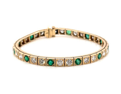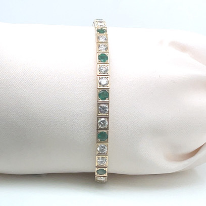 Diamond and Emerald Bracelet in 14KYG. 24 diamonds to equal 6.00 carats, and 11 emeralds to equal 2.75 carats set in 14 karat yellow gold.