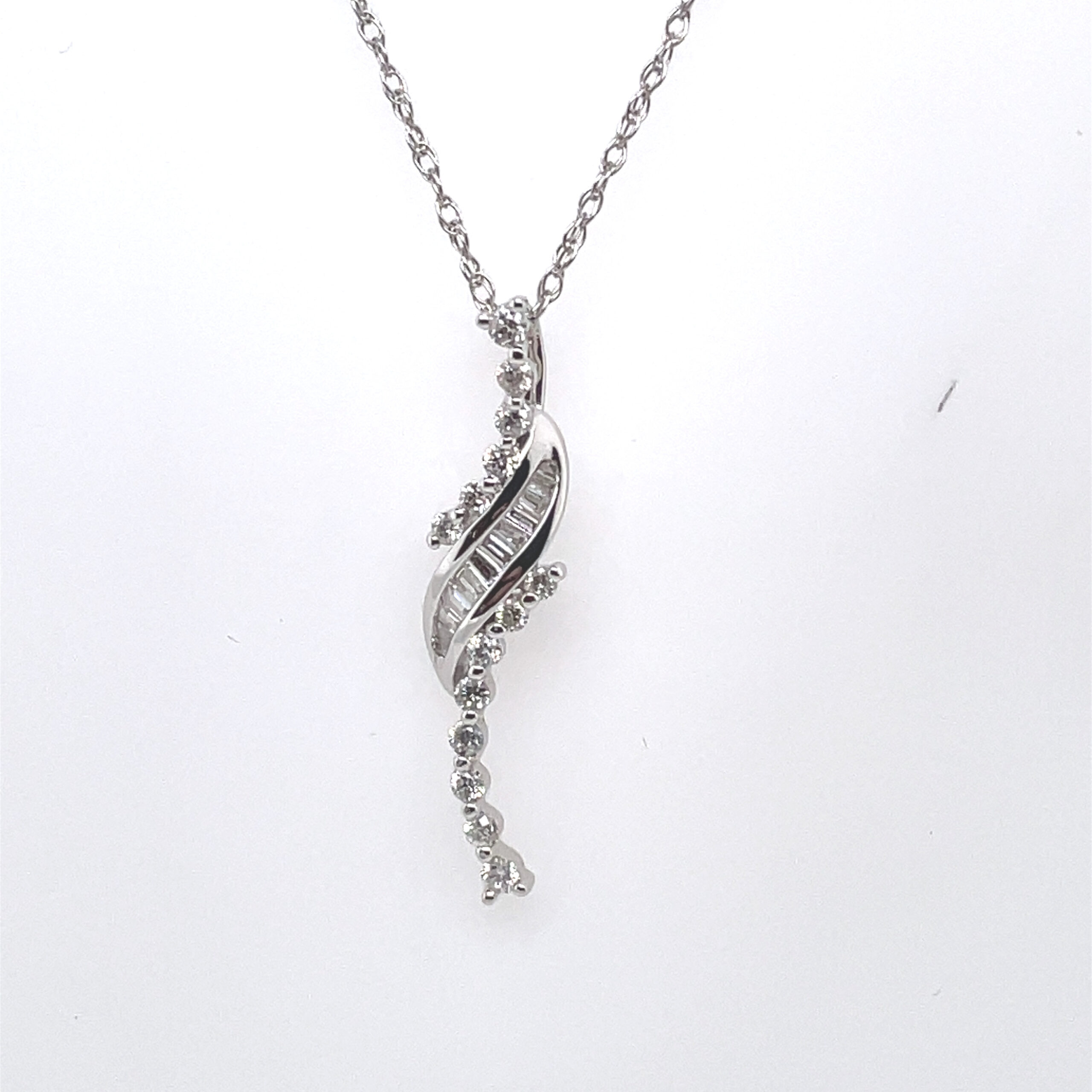 Diamond Drop Pendant in 18KWG with 18 brilliant round diamonds and baguettes.