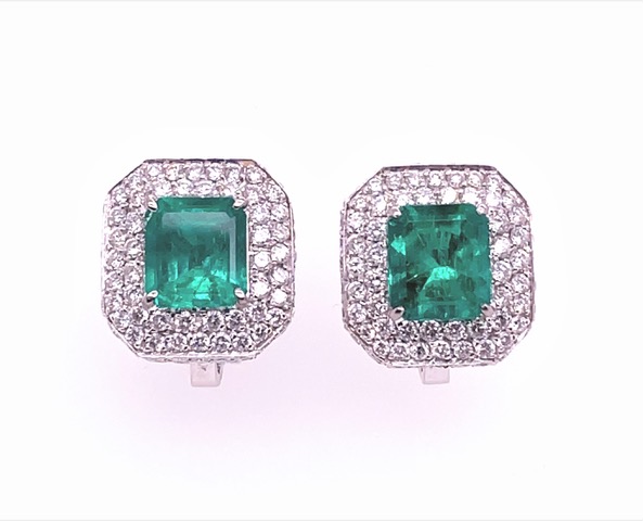 Emerald Earrings with Diamond Double-Halo in 18KWG. Two emeralds to equal 6.79 total carat weight with a diamond double halo of 280 diamonds to equal 3.05 total carat weight, set in 18 karat white gold earrings.