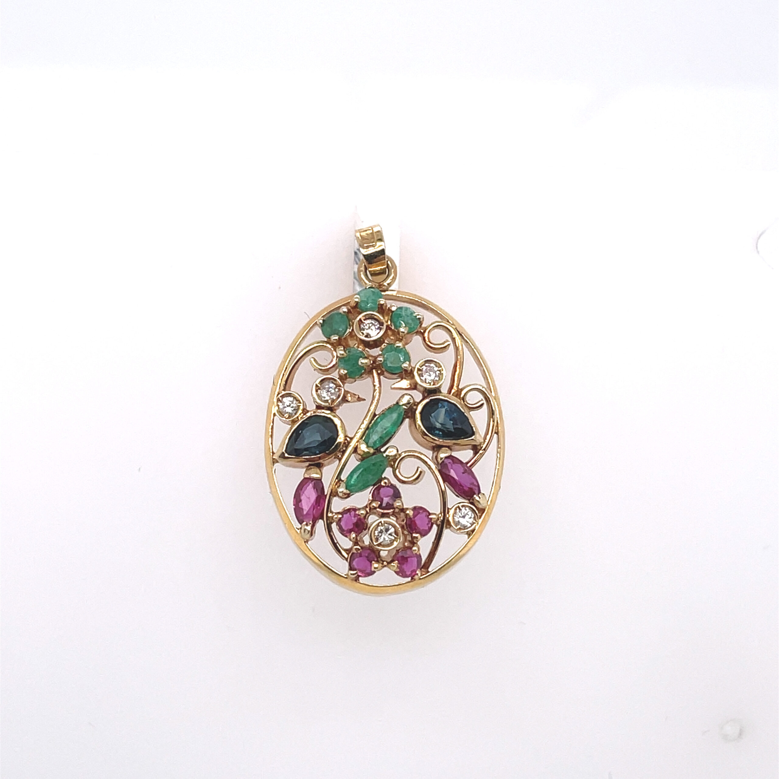 Floral Pendant with Sapphire, Ruby, Emerald and Diamond in 14KYG