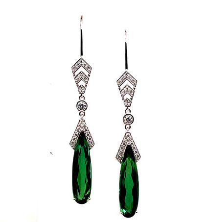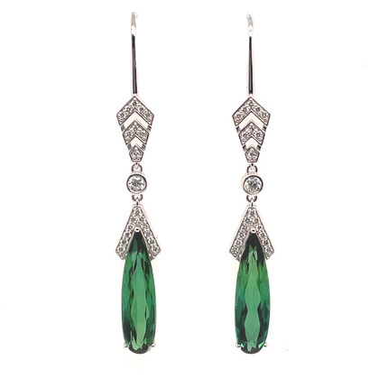 Mia Collection Tourmaline Drop Earrings, set with diamonds in 18 karat white gold. Two tourmalines to equal 7.96 total carat weight and diamonds to equal 0.43 total carat weight.