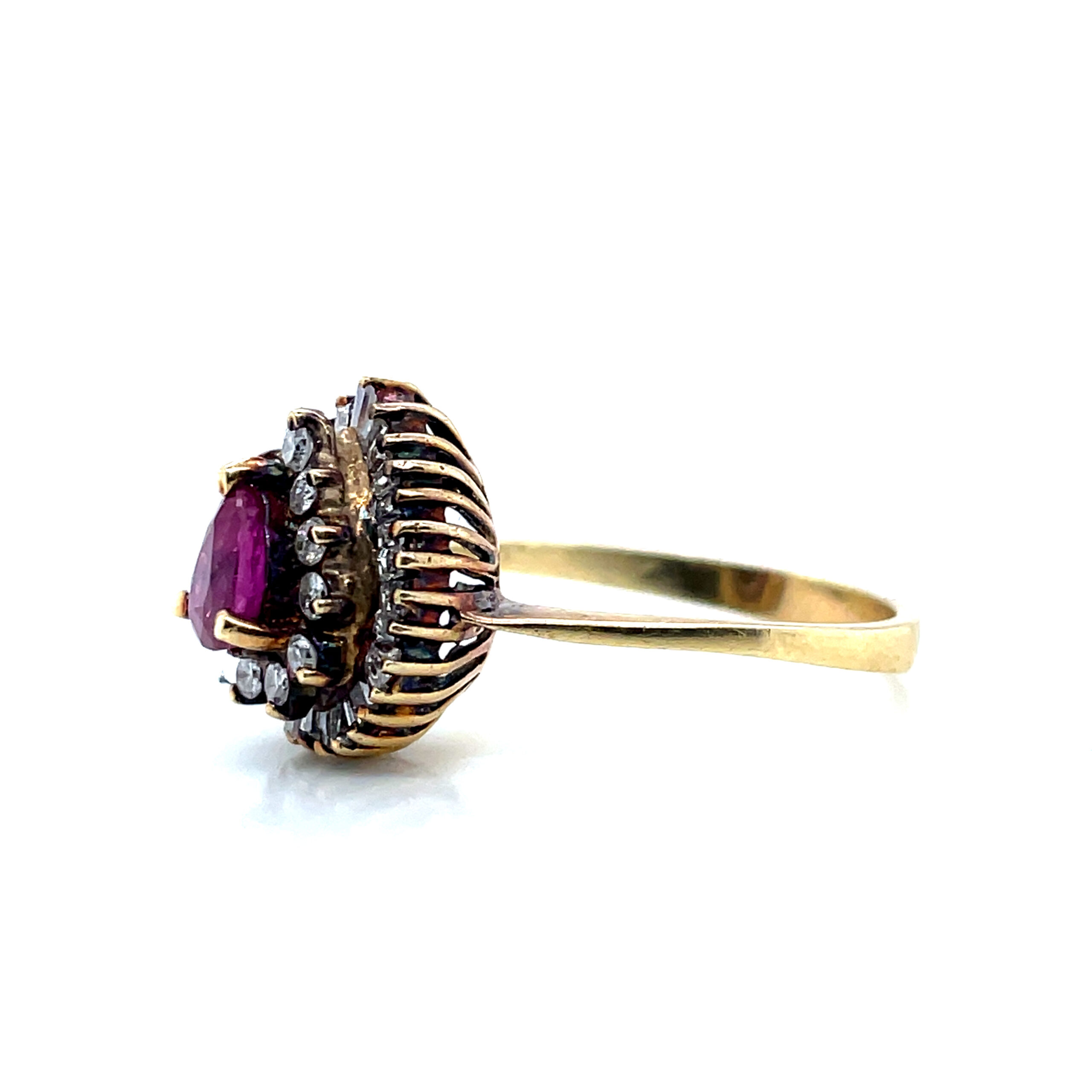 Pear-Shaped Ruby Ring with Diamonds in 14 karat yellow gold.