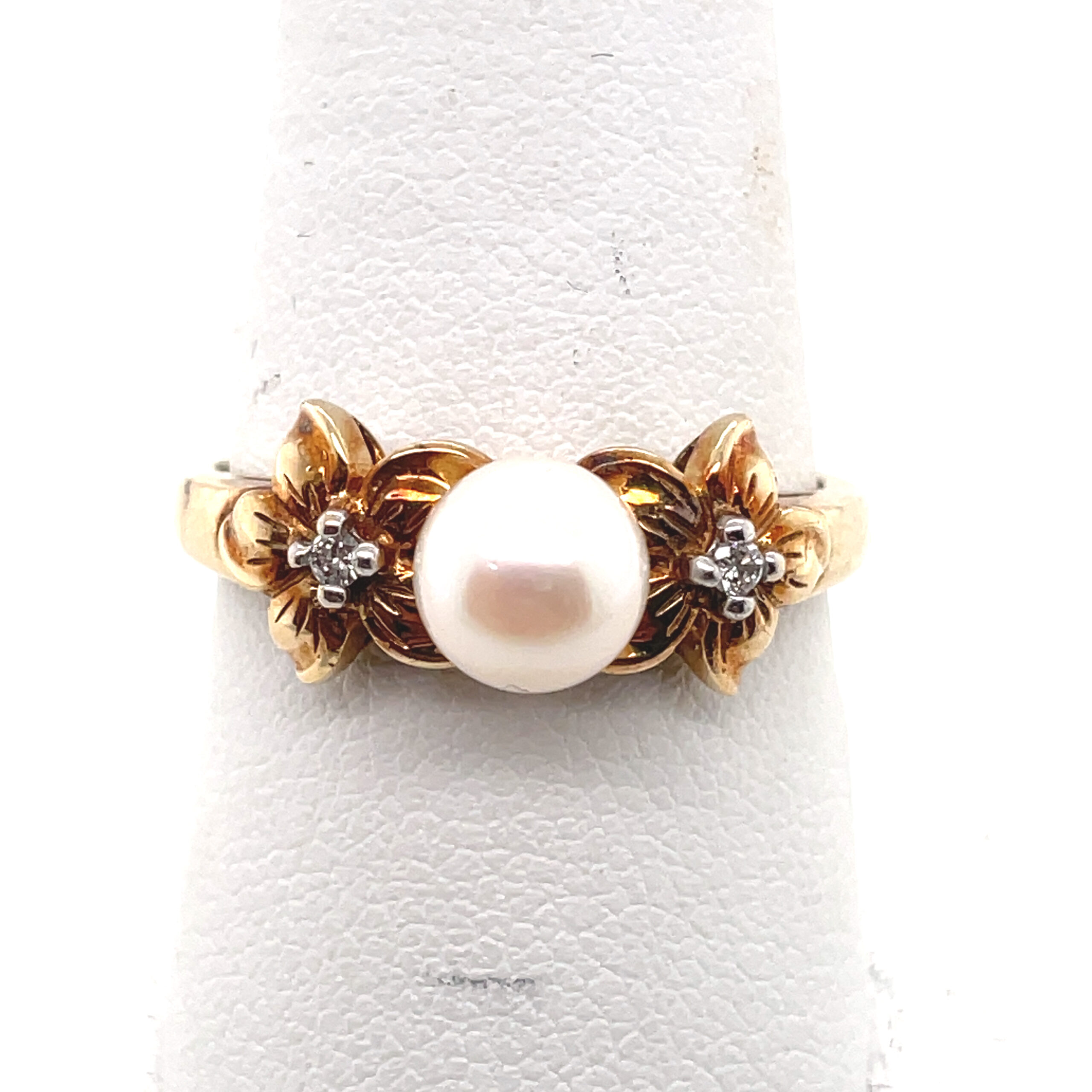 / Pearl Flower Ring with Diamonds in 10KYG