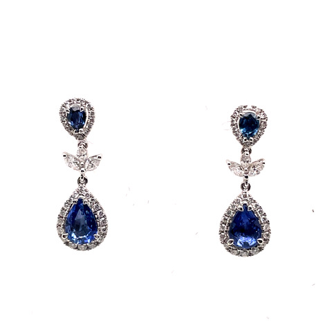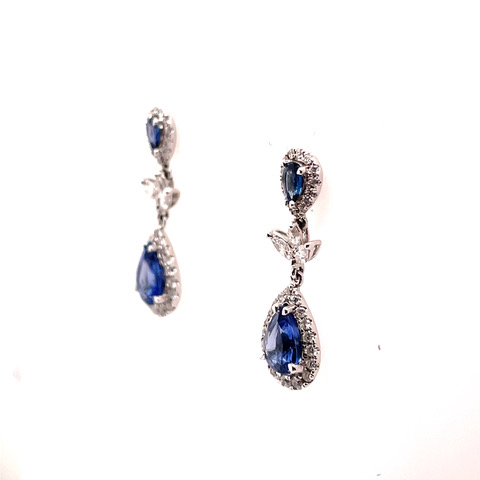 Sapphire and Diamond Halo Earrings in 18KWG. Four sapphires to equal 1.98 carats and 64 diamonds to equal 0.35 carats, set in 18 karat white gold.